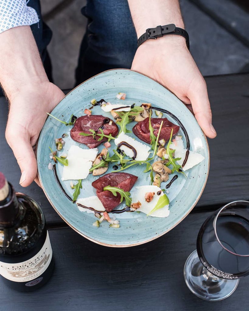 With a grand and satisfying pop, our glasses were filled with the ruby hues of Groot Constantia‘s Shiraz 2017, followed closely by our first appetizer for the afternoon, game carpaccio. A beautifully plated dish, it was an umami-inducing combination of smoked springbok, baby greens, salsa, marinated mushrooms and parmesan. Needless to say, between the delicately cured, almost creamy, springbok slices and the saltiness of the parmesan, it was a perfect match for the smooth tannins of the Shiraz.