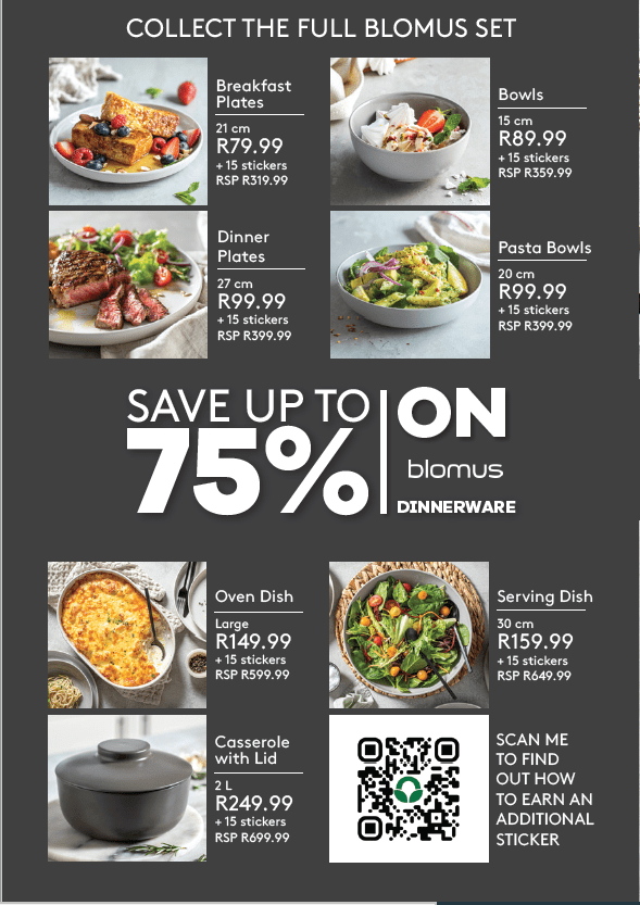 Shoppers can save up to 75% on Blomus Dinnerware by collecting 15 stickers and paying the additional fee to collect the Blomus Dinnerware (ranging from R79.99 for a breakfast plate to R249,99 for the casserole with lid). Stickers are issued for every R100 spent at Food Lover’s Market stores in South Africa and Namibia and Food Lover’s Eatery stores in