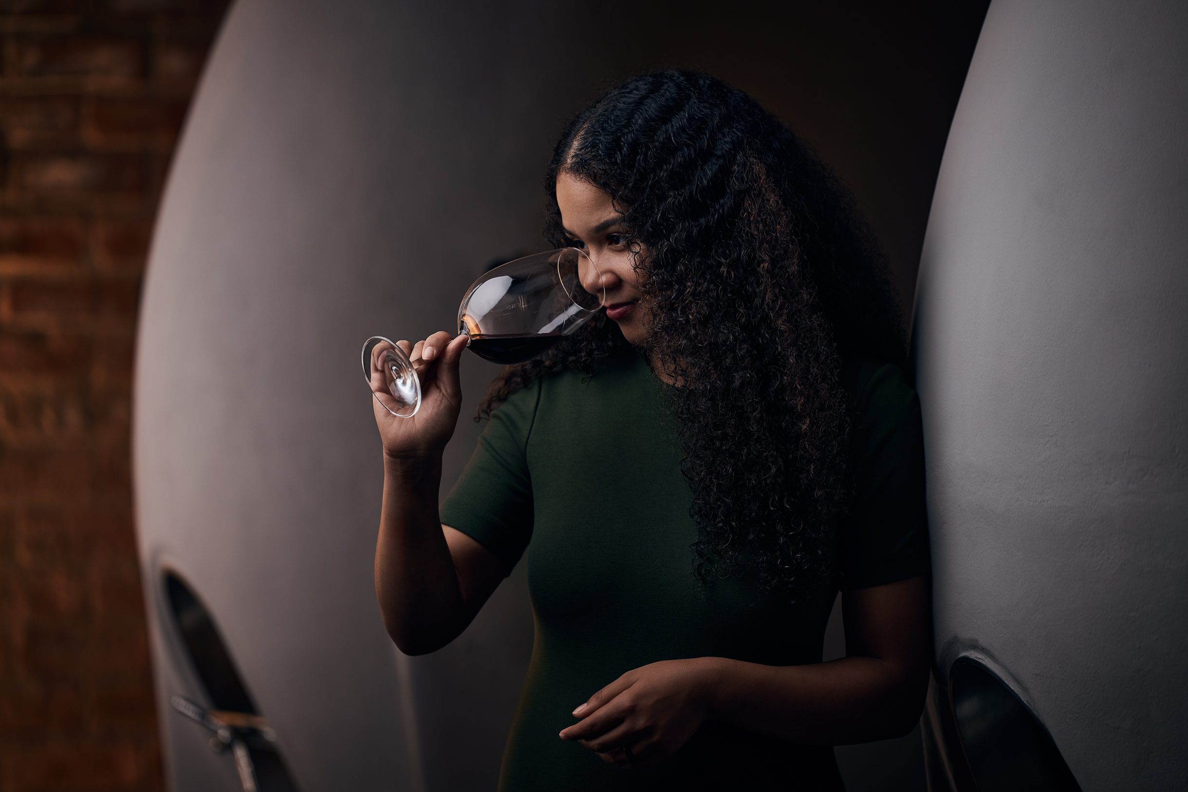 Brookdale Estate – Winemaker – Kiara Scott Farmer in Cellar with Wine