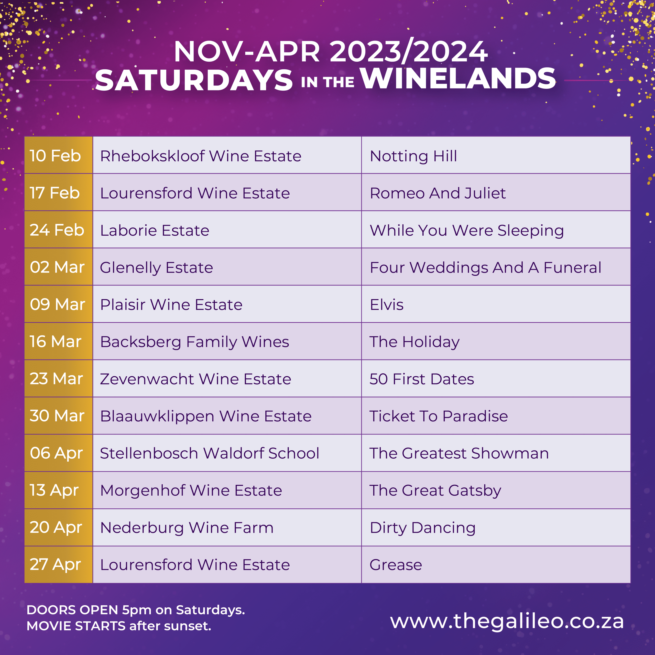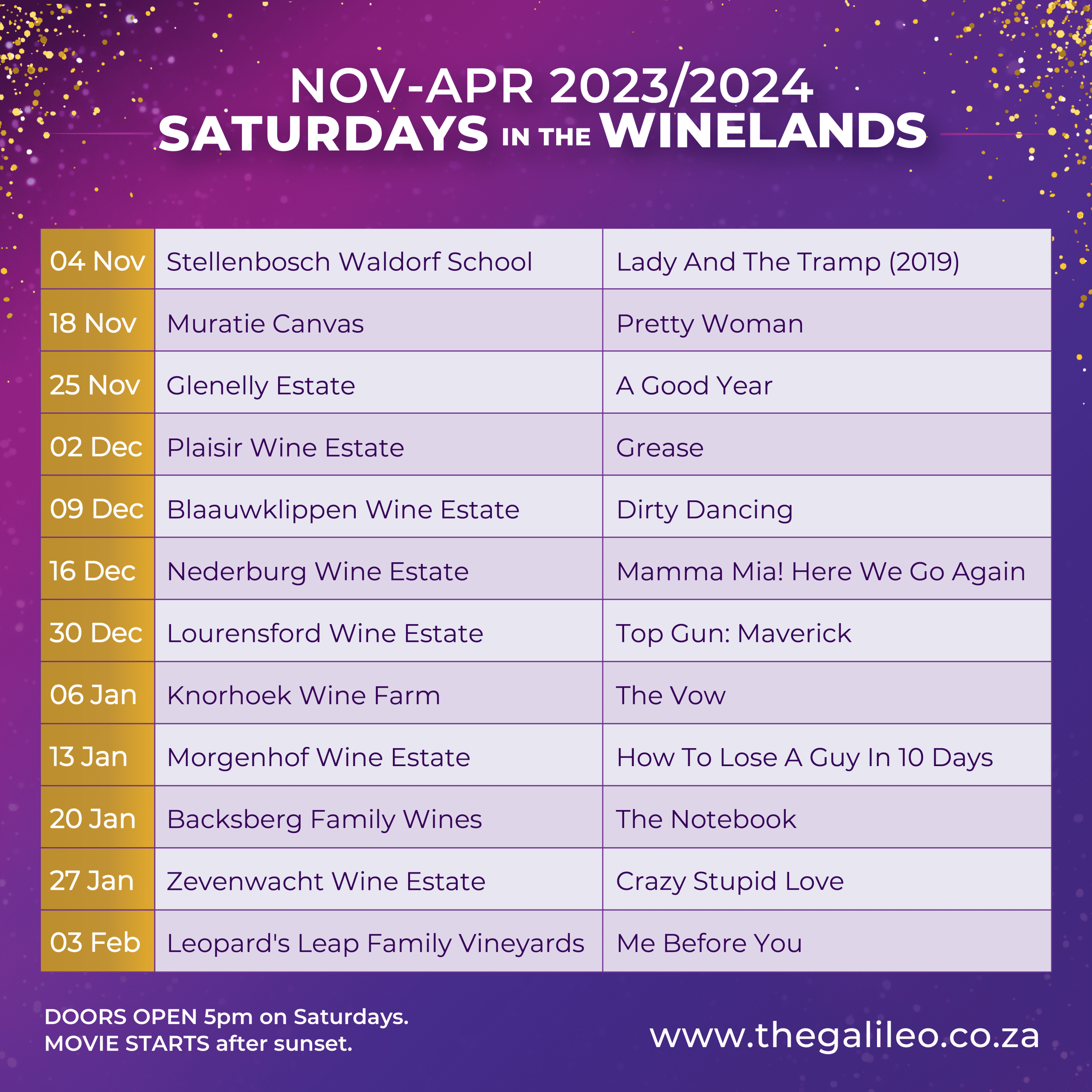 Every Saturday, the movie magic travels to roving venues that allow for the usual perks of a perfect Galileo evening, offering the opportunity to tick off some new wine farms on the local travel list or a good excuse for another visit to an already firm favourite. This twelfth season ensures all the favourite venues stay firmly in place, so earmark the dates accordingly and enjoy the iconic settings such as Leopards Leap, Blaauwklippen, Nederburg, Glenelly, and Lourensford estates as you soak in the wonderous setting, fine wines and unrivalled scenic beauty of these crowd-pleasing venues.